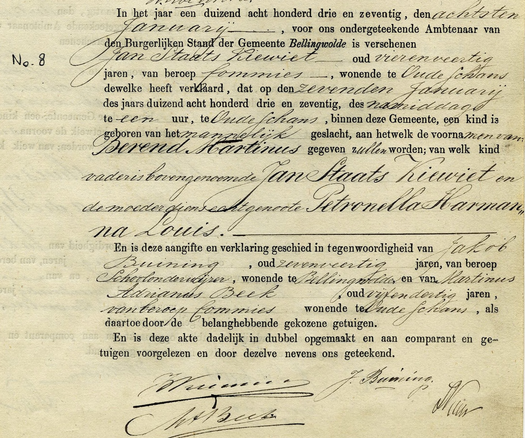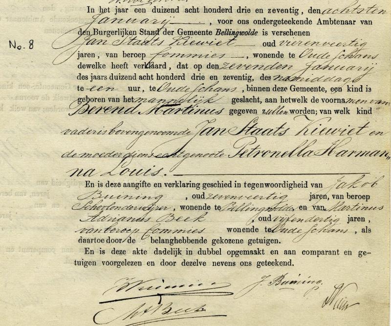 - Geboorteakte Berend Martinus Kiewiet