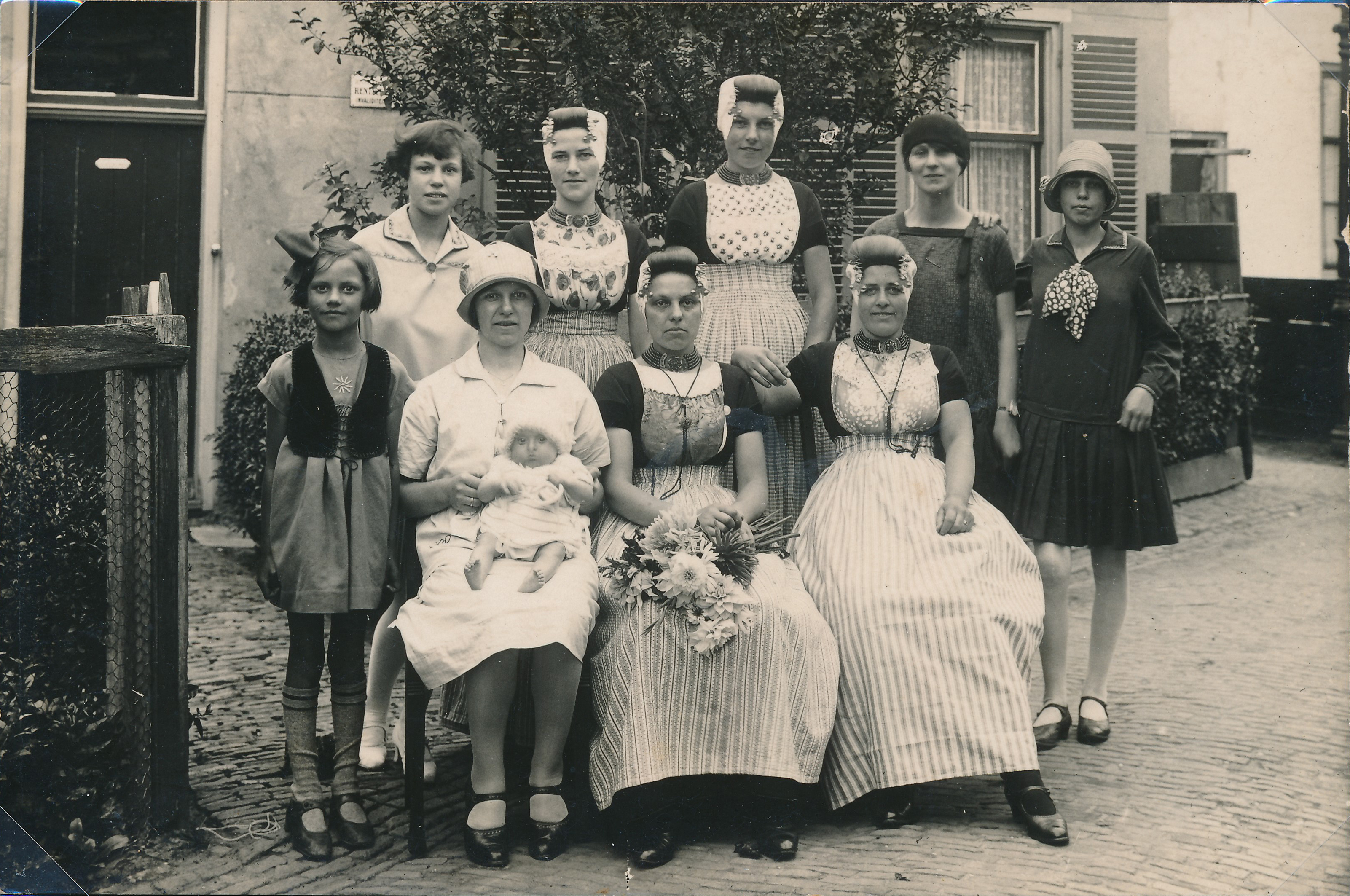 De vrouw met de bloemen is Koosje Alewijnse. Ze woonde op ’t Zand in het Kerkstraatje. Koosje was werkster voor het gezin van Jan Dorleijn in hun huis aan de Koudekerkseweg. Helemaal links staat Hennie Dorleijn.