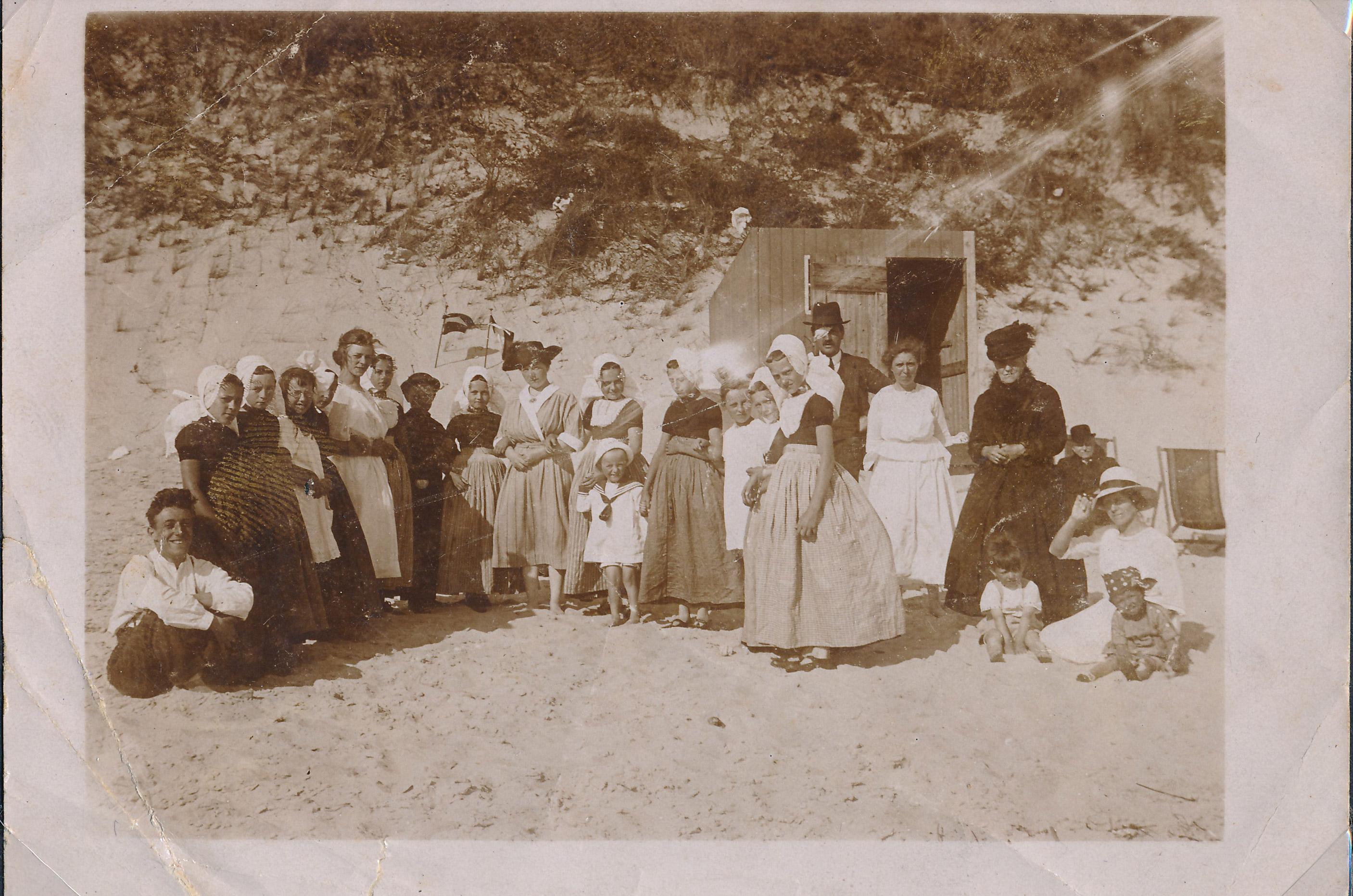 Het eerste strandhokje van Walcheren, gebouwd door Jan Dorleijn (1885; vader van tante Hennie; hij heeft een lapje voor z'n oog). Geheel rechts zit tante Claar (Beckers; 1886). In de deuropening staat tante Jaantje (Versluis). Ik neem aan dat tante Hennie voor haar moeder zit; in dat geval dateert de opname uit ongeveer 1924. Opname op het strand van Zoutelande.