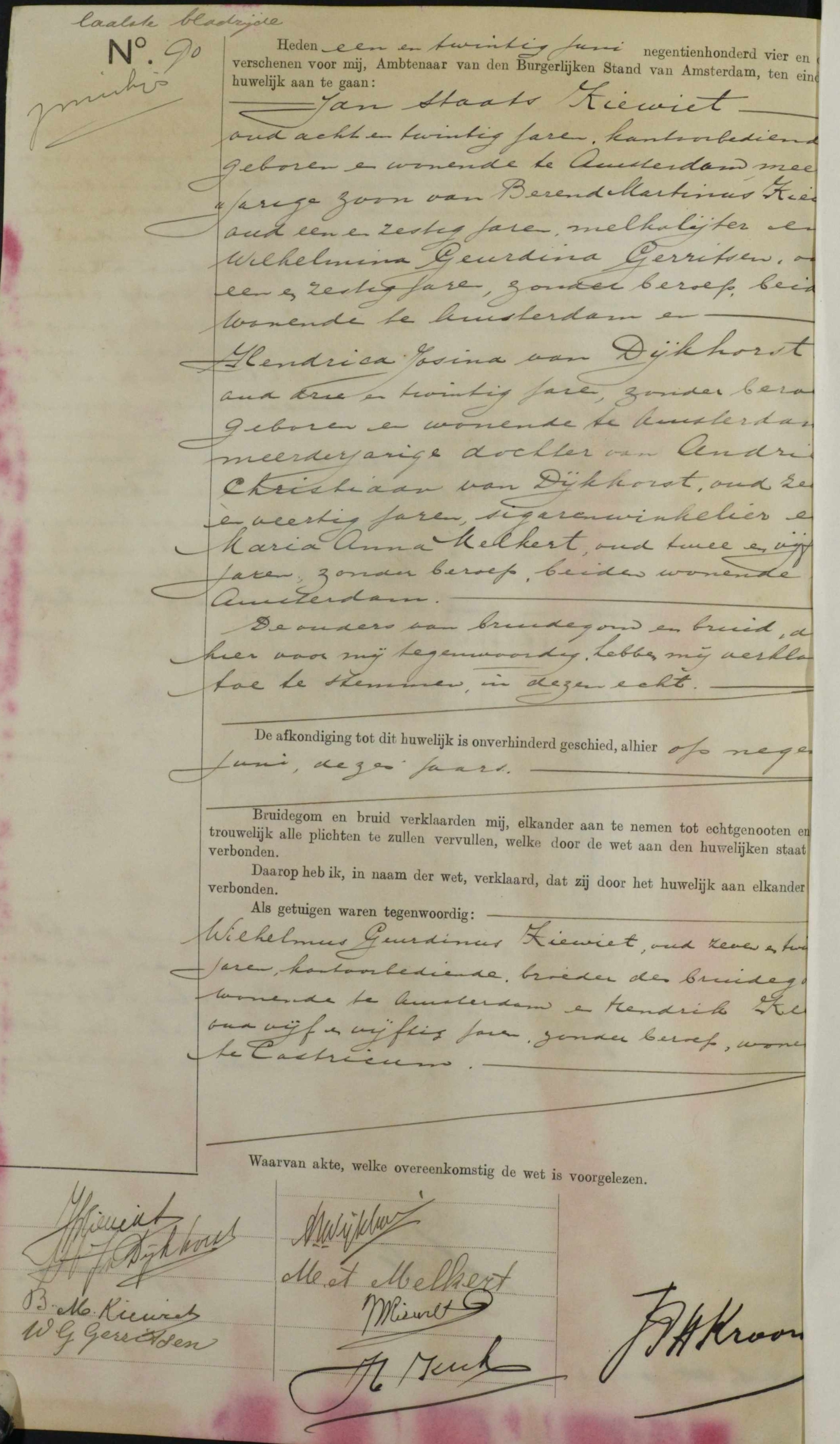 Huwelijksakte J.S. Kiewiet en H.J. van Dijkhorst