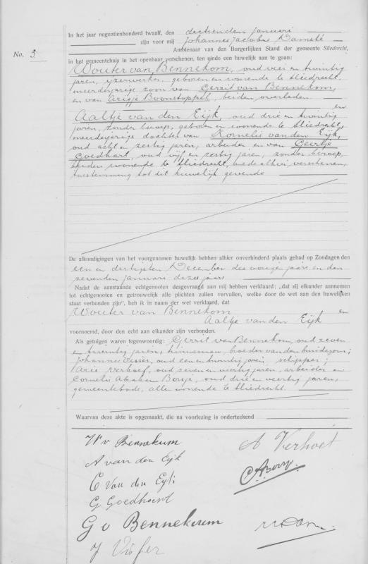Huwelijksakte Wouter van Bennekom en Aaltje van den Eijk