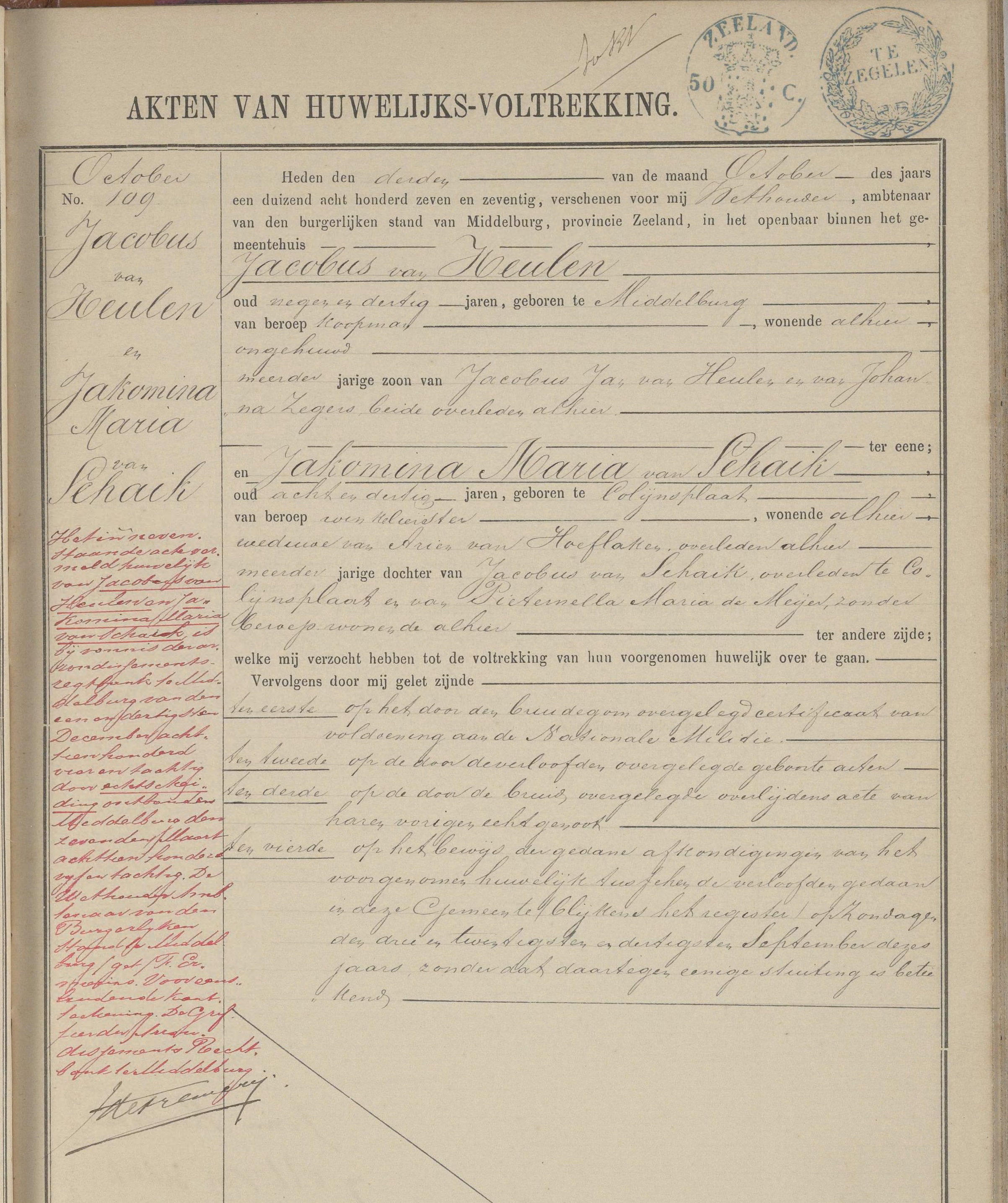 Huwelijksakte Jakomina Maria van Schaik en Jacobus van Heulen