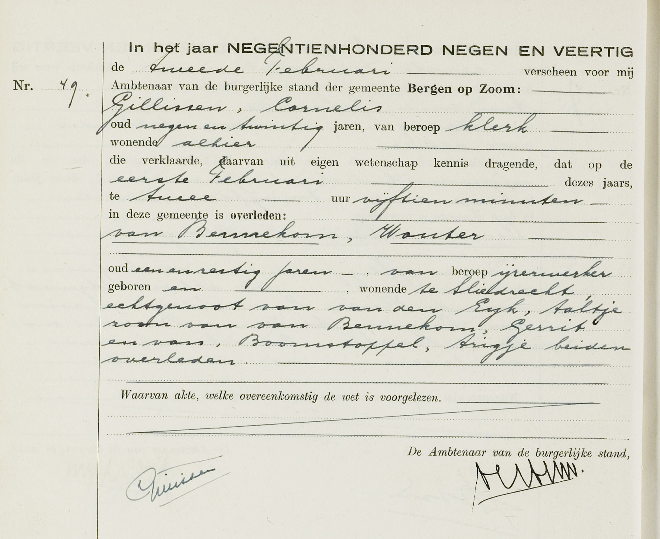 Overlijdensakte Wouter van Bennekom, 1949