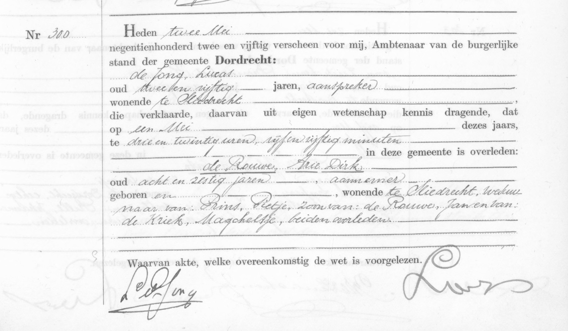 Overlijdensakte Arie Dirk de Rouwe, 01-05-1952